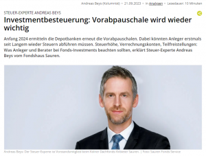 Im Gespräch mit Paul Barthels beleuchtet Andreas Beys, Vorstand der Sauren Fonds-Service AG, die steuerlichen Besonderheiten bei Investmentfonds. Darüber hinaus wird der Frage nachgegangen, welche Fondsart steuerlich die beste Voraussetzung hat und welche Möglichkeiten die Anleger und die Berater haben, um Steuern zu sparen.