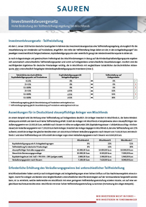 Im Rahmen des neuen Investmentsteuergesetzes führte der Gesetzgeber zum 01.01.2018 eine Teilfreistellungsregelung ein. Der aktuelle 2-Seiter zeigt die hohe Bedeutung der Teilfreistellungsregelung bei Mischfonds auf. Anhand von Rechenbeispielen mit unterschiedlicher Teilfreistellung werden die möglichen hieraus resultierenden großen steuerlichen Unterschiede für Privatanleger aufgezeigt.